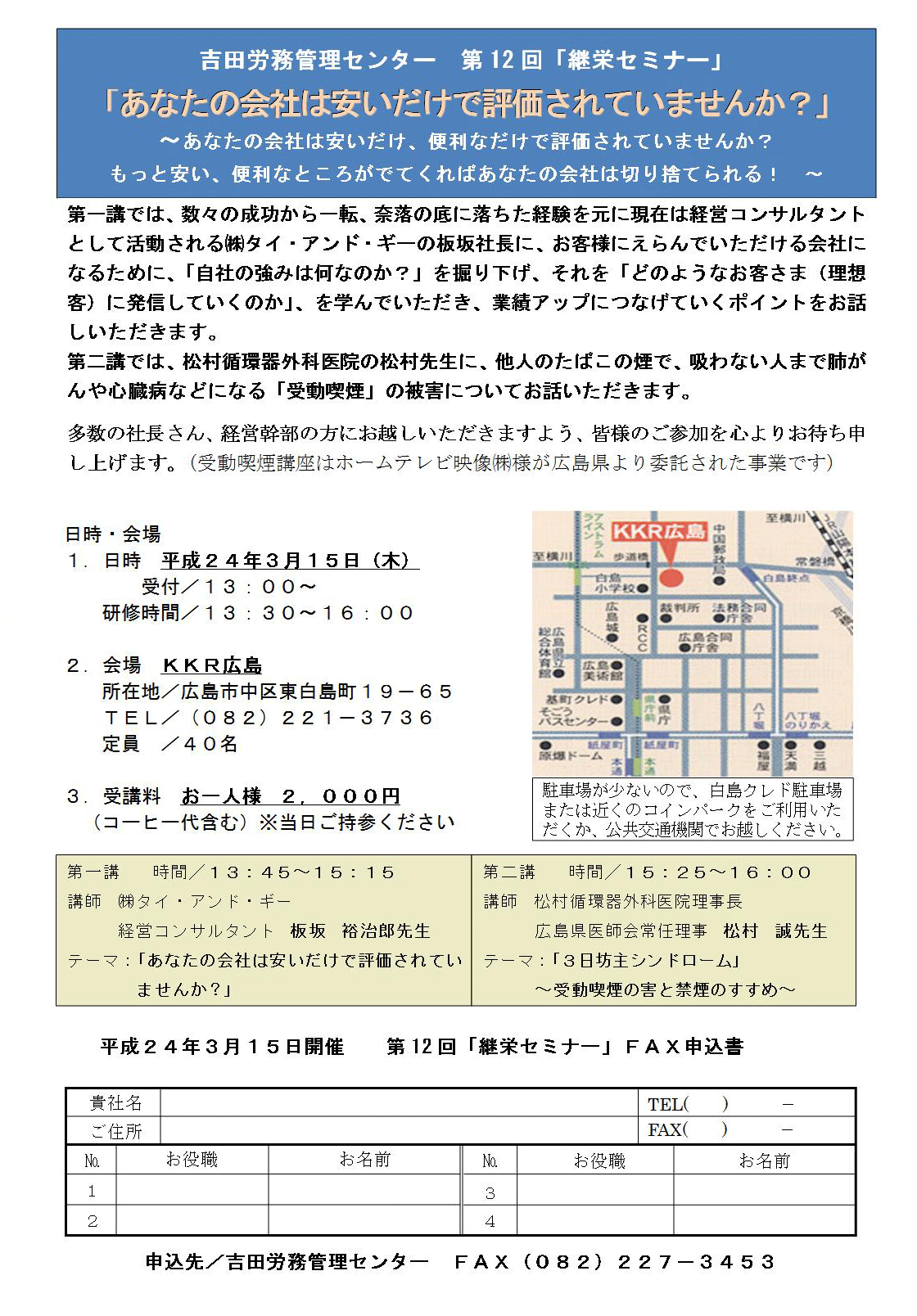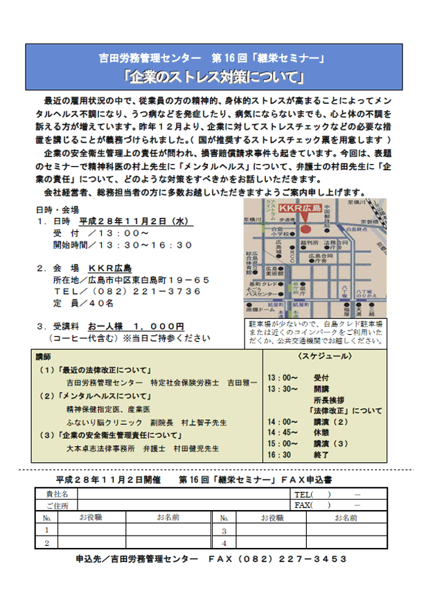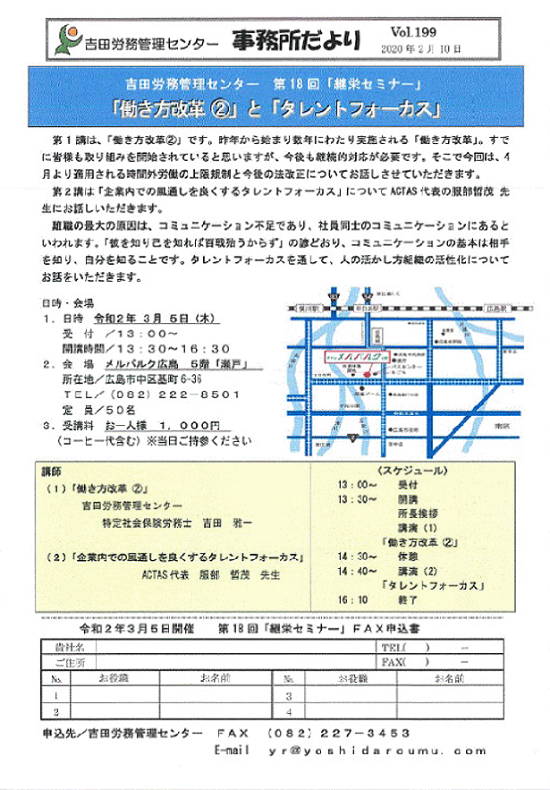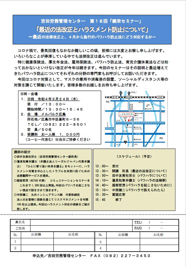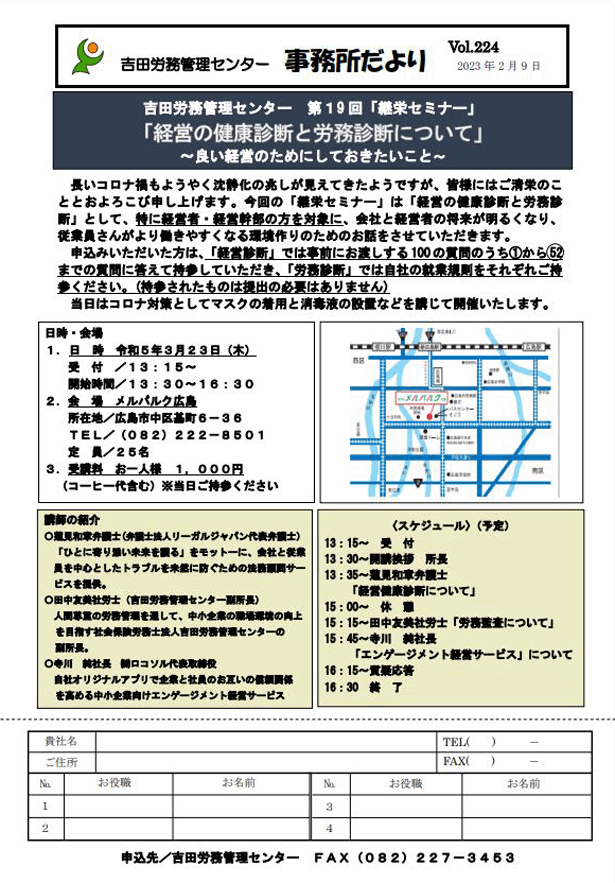 ・「経営の健康診断と労務診断について」 日時 令和5年3月23日(木)13時15分受付開始 13:30〜16:30 場所 メルパルク広島