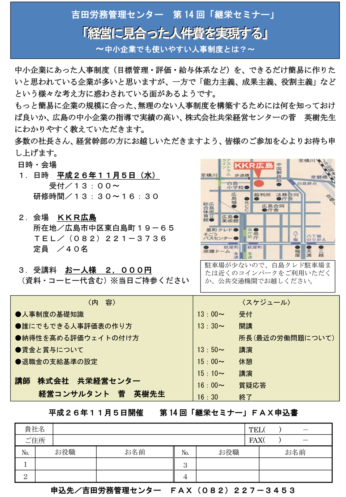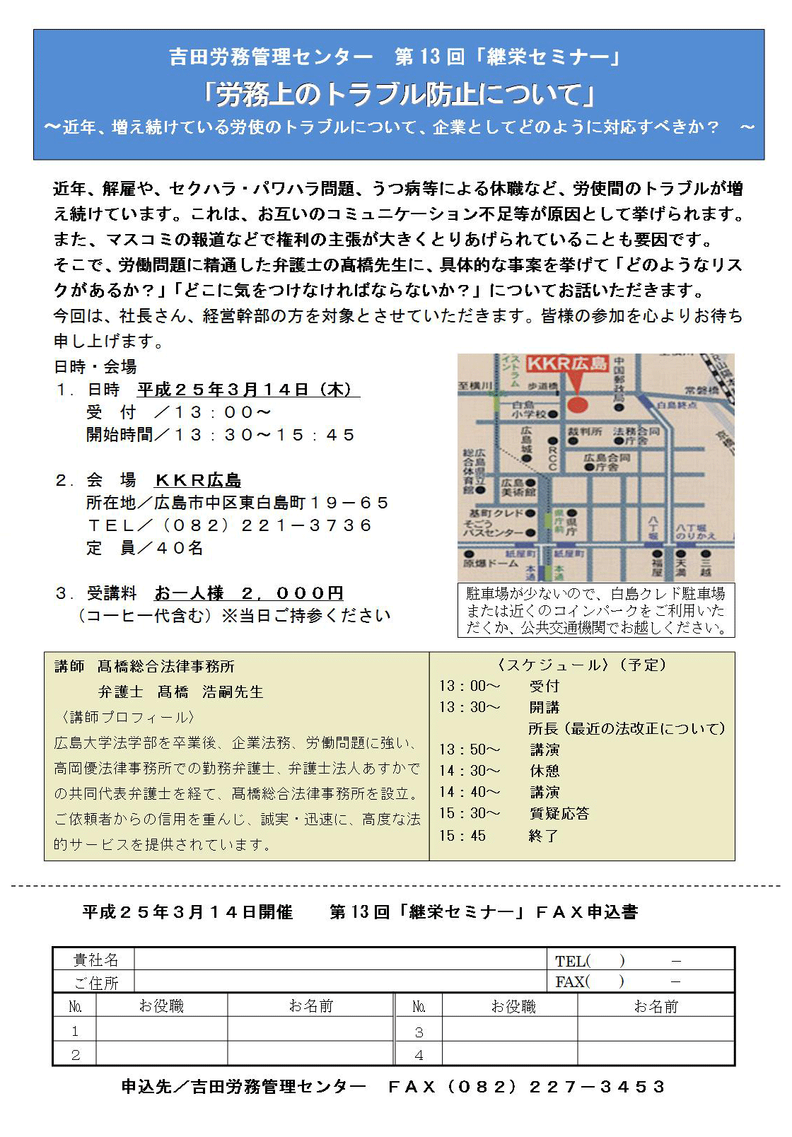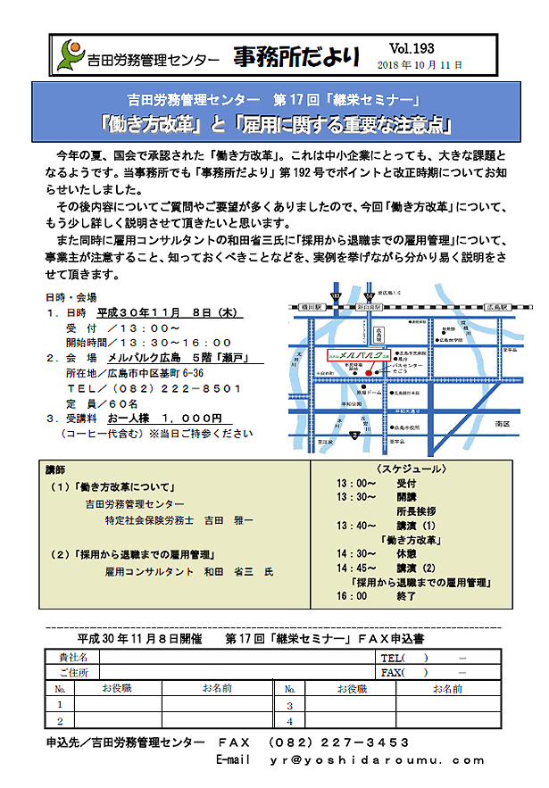 ・「経営の健康診断と労務診断について」 日時 令和5年3月23日(木)13時15分受付開始 13:30〜16:30 場所 メルパルク広島