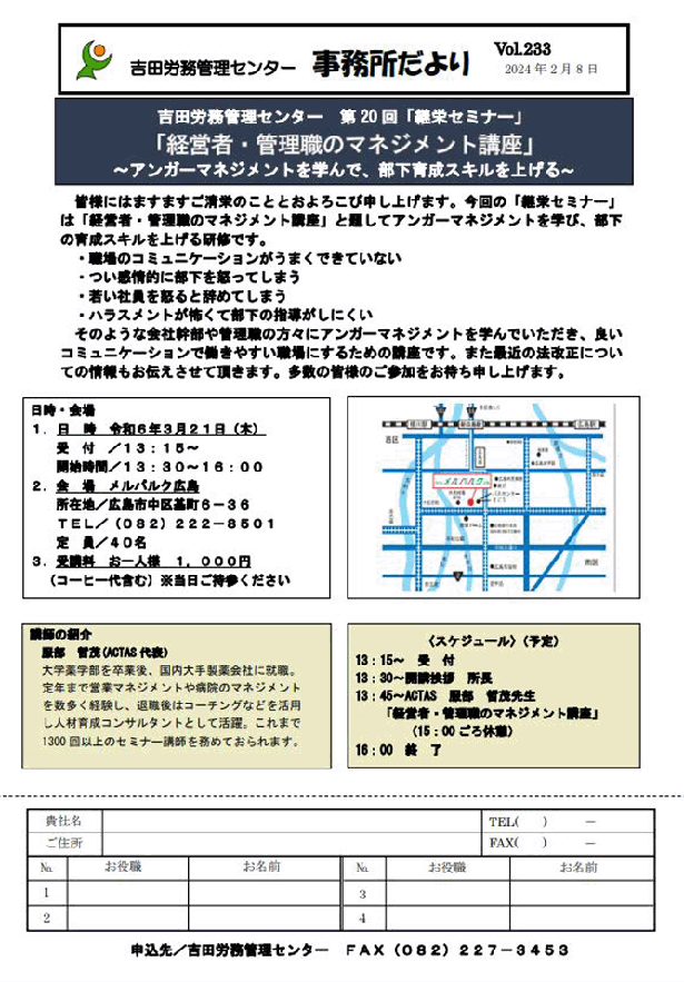 ・「経営者・管理職のマネジメント講座」 〜アンガーマネジメントを学んで、部下育成スキルを上げる〜 日時 令和6年3月21日(木)13時15分受付開始 13:30〜16:00 場所 メルパルク広島 ※このセミナーは終了しました