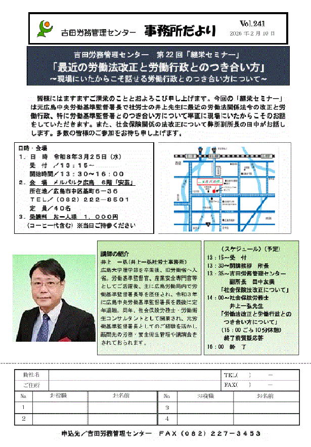 ・第22回継栄セミナーのご案内 「最近の労働法改正と労働行政とのつき合い方」 〜現場にいたからこそ話せる労働行政とのつき合い方について」 日時:令和8年3月25日(水)13:30〜 場所:メルパルク広島 講師:井上 一弘(井上一弘社労士事務所)