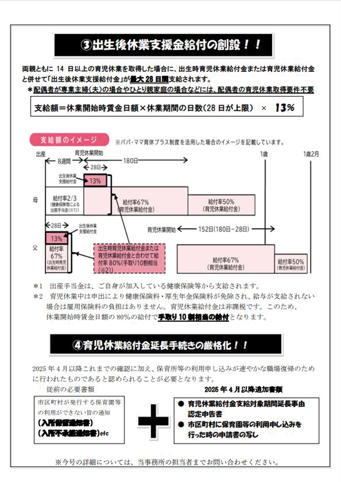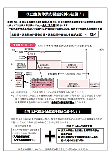 当事務所では、少子化対策として女性・男性が仕事と家庭を両立するための仕組みを作り、全面的に支援をします。 これにより安心して仕事へ取り組み、幸せな家庭生活の応援をします。