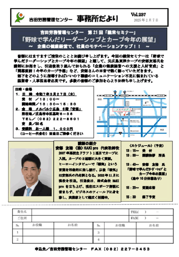 ・「野球で学んだリーダーシップとカープ今年の展望」〜企業の健康経営で、社員のモチベーションアップ!!〜 日時:令和7年3月27日(木)13:30〜 場所:メルパルク広島 講師:安部 友裕 氏(元広島東洋カープ) ※このセミナーは終了しました
